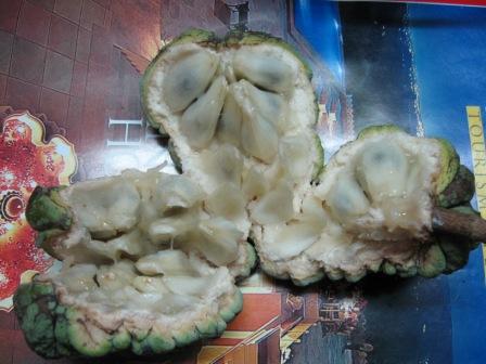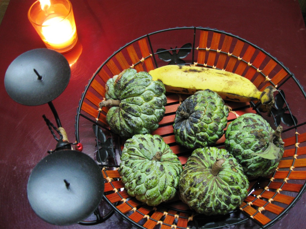 気分転換に、最近気に入っているシャリーファーという果物について書いてみた。 シャリーファー(Sharifa)。英語だとカスタード・アップル(custard apple)、というらしい。店で見かける頻度はさほど高くない。熟れてやわらかくなって、手で割れるようになってからが食べごろ。初めて買ったとき、知らずに硬い状態のを食べようとして苦労した。中の様子はこんな感じ。 中にうっすらと透けて黒く見えるのが種。種を包むように可食部があるため、きれいに食べるのは難しい。人前で食べたくはない。実はとろけてクリーミー。カスタード・アップルと呼ばれるのはそれ故と思われる。味は熟れた洋梨に近く、甘みが強い。ザリザリした食感がある。 PR