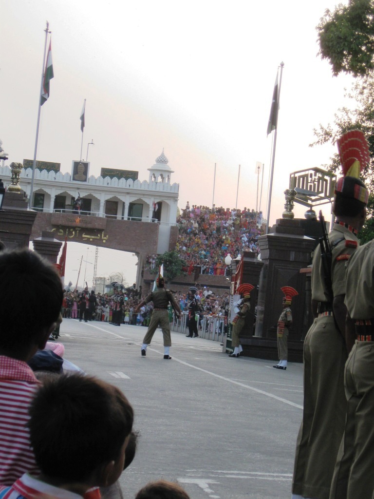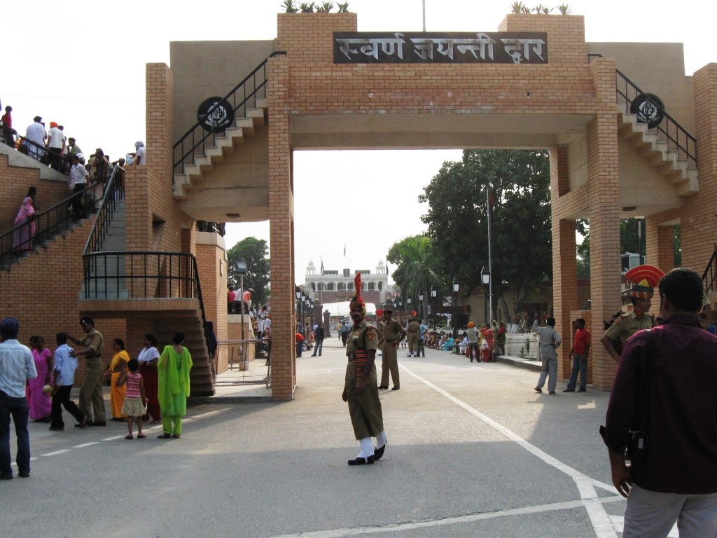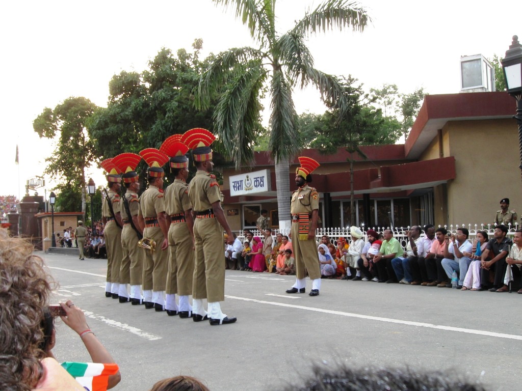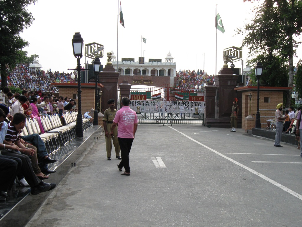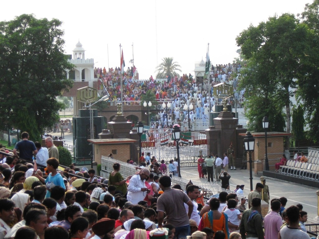 8月2日(日) 二日目朝はゆっくりスタート。 夕方に印パ国境を見に行くという一大イヴェントはあるが、それ以外は特に予定がない。 10時頃、ホテルを出て朝食の場所を探す。ちなみに、ホテルにレストランはない。前日に脳カレーを食べたCrystalへ行くが、まだ開いていなかった。11時からだとか。そこで右往左往していると、サイクル・リクシャーが声をかけてきたので、朝食を食べられるレストランへ連れて行ってもらった。黄金寺院の近く、Bharawan Da Dhaba。老舗の名店らしい。食堂といった感じの造り。値段も手ごろなベジ・レストラン(そういえば、サイクル・リクシャーの運転手にはノンベジと言ったのだが)。 アムリトサル・パニール・クルチャをオーダー(Rs. 25)。小麦ベースの生地に、パニールが練りこまれている。柔らかいピザのような感じ。とても気にいった。 それから、ホテルのオヤジが紹介してくれた、黄金寺院とは別のシク寺院を目指す。名称は忘れた。 たどり着いてみると、そこは黄金寺院そっくり。靴を預け、足を洗って入る。規模はおそらく同じ。ただし全体的に装飾のクオリティや人数が低く、黄金寺院の7割引といったイメージ。人々の幸せオーラも7割引。中心の寺院も、黄金化途上。 時間はあるのでじっくり見学。正直なところ、前日の黄金寺院との比較から、安っぽさを感じる。その後、みやげ物屋で孔雀の羽根の団扇を買う(Rs. 20)。このとき、Rs. 10のコインを使って支払ったところ、とても珍しがられた。 すでに消耗していたので、ジャリヤーンワーラー庭園近くのCafé Coffee Day(カフェ)で休憩。自分たち以外の客すべてが欧米系という異空間がそこには構成されていた。店員はターバンを巻いたシク教徒のスマートなお兄さん。店内の様子を写真で撮って見せたら、そこがインドだとわかる人はいないだろう。まるでロンドンかニューヨークの光景(行ったことはないが)。 そこからサイクル・リクシャーで、ホテル近くのラーム庭園を目指す。そこにある(らしい)州立博物館が目当て。インドで、「州立博物館」なるものにいい思い出はないが、ほかに行く場所もなかったので。 木の茂る公園のような一角があった。しかし州立博物館は見つからない。その代りに、妙に手入れの行きとどいた庭園を見つけた。近づくと、博物館らしきものがあった。建物の名前は、Maharaja Ranjit Singh Panorama…?なんだろう、パノラマって。 とにかく入ってみる。入場料は通常Rs. 10。学生割引を使ってRs. 5にした。一流ホテルばりにきれいな庭園を通り、「パノラマ」へ。そこは、この地域をかつて支配したマハラジャであるRanjit Singhの業績をたたえるための博物館。「パノラマ」とは、絵と模型を使って歴史上のシーンを再現したもののことらしい。かなり大規模で、かつコンピューターを使って歴史を学べるコーナーなどもあり、充実。2006年に完成した新しい博物館だ。エアコンがしっかり効いているのもうれしい。 その後、近くの食堂で昼食をとり(特記事項なし)、ホテルへ戻る。夕方からのワガ・ボーダー行きに備えて休憩。 インド側アムリトサルから車で30分、パキスタン側ラホールから40分のところに位置する印パ国境ワガ・ボーダー(Waga Border)。日の入り頃に、国境を閉める「クロージング・セレモニー(Closing Ceremony)」が行われる。国境を閉めて国旗を下げるだけなのだが、インド側とパキスタン側がそれを競うように行うので、盛り上がるのだ。スポーツの日韓戦のイメージが近いと思う。黄金寺院の周りでは、国境行きの車やオート・リクシャーが大量におり、呼び込みを行っていた。おそらく、アムリトサルでは黄金寺院と並ぶ観光スポットなのだ。 午後4時半、ホテルのオヤジに手配してもらったタクシーが到着(トータルRs. 500)。まったく時間どおり。時間どおりに来るとは思っていなかったので、あわてて準備をしてタクシーに乗り込む。 タクシーは猛スピードで印パ国境へ。30分くらいで到着。目的のセレモニーは6時30分からだというから急がなくてもよかったのだが。すでに多くの観光客でごったがえしていた。 国境のゲートをはさんで、印パ双方の側に、大きな観客席が設けられている。大勢の観光客が押し寄せる。売店もあり、スナックや飲み物が正規価格で売られている。 手前の構えはインド側。奥はもうパキスタン側。