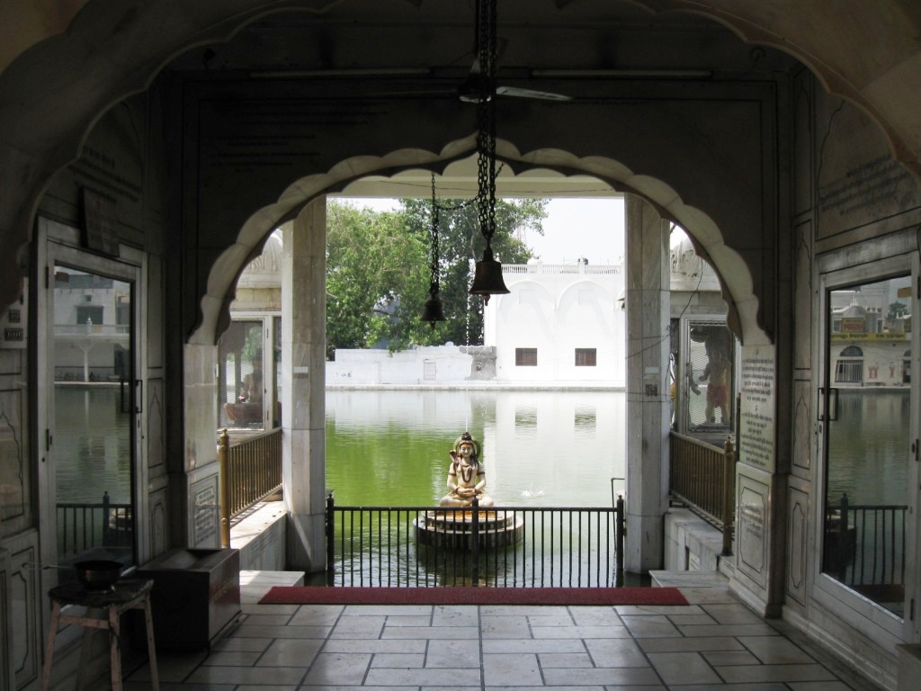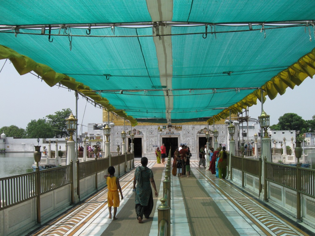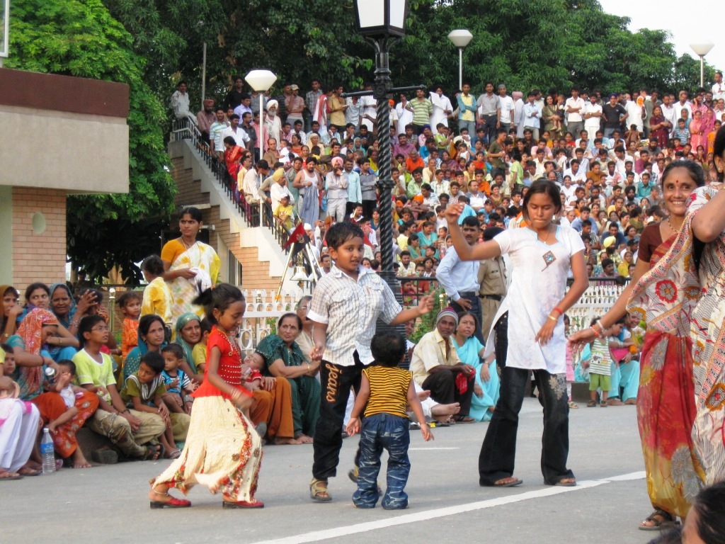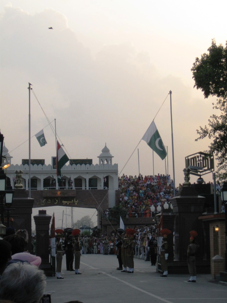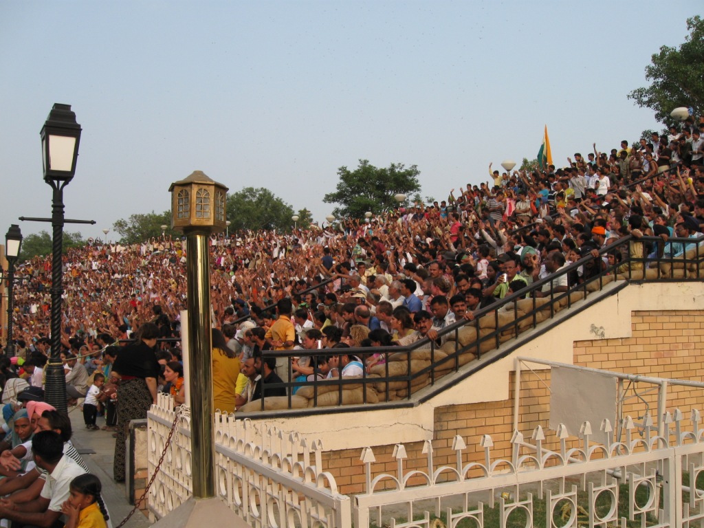 8月2日(日) 二日目朝はゆっくりスタート。 夕方に印パ国境を見に行くという一大イヴェントはあるが、それ以外は特に予定がない。 10時頃、ホテルを出て朝食の場所を探す。ちなみに、ホテルにレストランはない。前日に脳カレーを食べたCrystalへ行くが、まだ開いていなかった。11時からだとか。そこで右往左往していると、サイクル・リクシャーが声をかけてきたので、朝食を食べられるレストランへ連れて行ってもらった。黄金寺院の近く、Bharawan Da Dhaba。老舗の名店らしい。食堂といった感じの造り。値段も手ごろなベジ・レストラン(そういえば、サイクル・リクシャーの運転手にはノンベジと言ったのだが)。 アムリトサル・パニール・クルチャをオーダー(Rs. 25)。小麦ベースの生地に、パニールが練りこまれている。柔らかいピザのような感じ。とても気にいった。 それから、ホテルのオヤジが紹介してくれた、黄金寺院とは別のシク寺院を目指す。名称は忘れた。 たどり着いてみると、そこは黄金寺院そっくり。靴を預け、足を洗って入る。規模はおそらく同じ。ただし全体的に装飾のクオリティや人数が低く、黄金寺院の7割引といったイメージ。人々の幸せオーラも7割引。中心の寺院も、黄金化途上。 時間はあるのでじっくり見学。正直なところ、前日の黄金寺院との比較から、安っぽさを感じる。その後、みやげ物屋で孔雀の羽根の団扇を買う(Rs. 20)。このとき、Rs. 10のコインを使って支払ったところ、とても珍しがられた。 すでに消耗していたので、ジャリヤーンワーラー庭園近くのCafé Coffee Day(カフェ)で休憩。自分たち以外の客すべてが欧米系という異空間がそこには構成されていた。店員はターバンを巻いたシク教徒のスマートなお兄さん。店内の様子を写真で撮って見せたら、そこがインドだとわかる人はいないだろう。まるでロンドンかニューヨークの光景(行ったことはないが)。 そこからサイクル・リクシャーで、ホテル近くのラーム庭園を目指す。そこにある(らしい)州立博物館が目当て。インドで、「州立博物館」なるものにいい思い出はないが、ほかに行く場所もなかったので。 木の茂る公園のような一角があった。しかし州立博物館は見つからない。その代りに、妙に手入れの行きとどいた庭園を見つけた。近づくと、博物館らしきものがあった。建物の名前は、Maharaja Ranjit Singh Panorama…?なんだろう、パノラマって。 とにかく入ってみる。入場料は通常Rs. 10。学生割引を使ってRs. 5にした。一流ホテルばりにきれいな庭園を通り、「パノラマ」へ。そこは、この地域をかつて支配したマハラジャであるRanjit Singhの業績をたたえるための博物館。「パノラマ」とは、絵と模型を使って歴史上のシーンを再現したもののことらしい。かなり大規模で、かつコンピューターを使って歴史を学べるコーナーなどもあり、充実。2006年に完成した新しい博物館だ。エアコンがしっかり効いているのもうれしい。 その後、近くの食堂で昼食をとり(特記事項なし)、ホテルへ戻る。夕方からのワガ・ボーダー行きに備えて休憩。 インド側アムリトサルから車で30分、パキスタン側ラホールから40分のところに位置する印パ国境ワガ・ボーダー(Waga Border)。日の入り頃に、国境を閉める「クロージング・セレモニー(Closing Ceremony)」が行われる。国境を閉めて国旗を下げるだけなのだが、インド側とパキスタン側がそれを競うように行うので、盛り上がるのだ。スポーツの日韓戦のイメージが近いと思う。黄金寺院の周りでは、国境行きの車やオート・リクシャーが大量におり、呼び込みを行っていた。おそらく、アムリトサルでは黄金寺院と並ぶ観光スポットなのだ。 午後4時半、ホテルのオヤジに手配してもらったタクシーが到着(トータルRs. 500)。まったく時間どおり。時間どおりに来るとは思っていなかったので、あわてて準備をしてタクシーに乗り込む。 タクシーは猛スピードで印パ国境へ。30分くらいで到着。目的のセレモニーは6時30分からだというから急がなくてもよかったのだが。すでに多くの観光客でごったがえしていた。 国境のゲートをはさんで、印パ双方の側に、大きな観客席が設けられている。大勢の観光客が押し寄せる。売店もあり、スナックや飲み物が正規価格で売られている。 手前の構えはインド側。奥はもうパキスタン側。