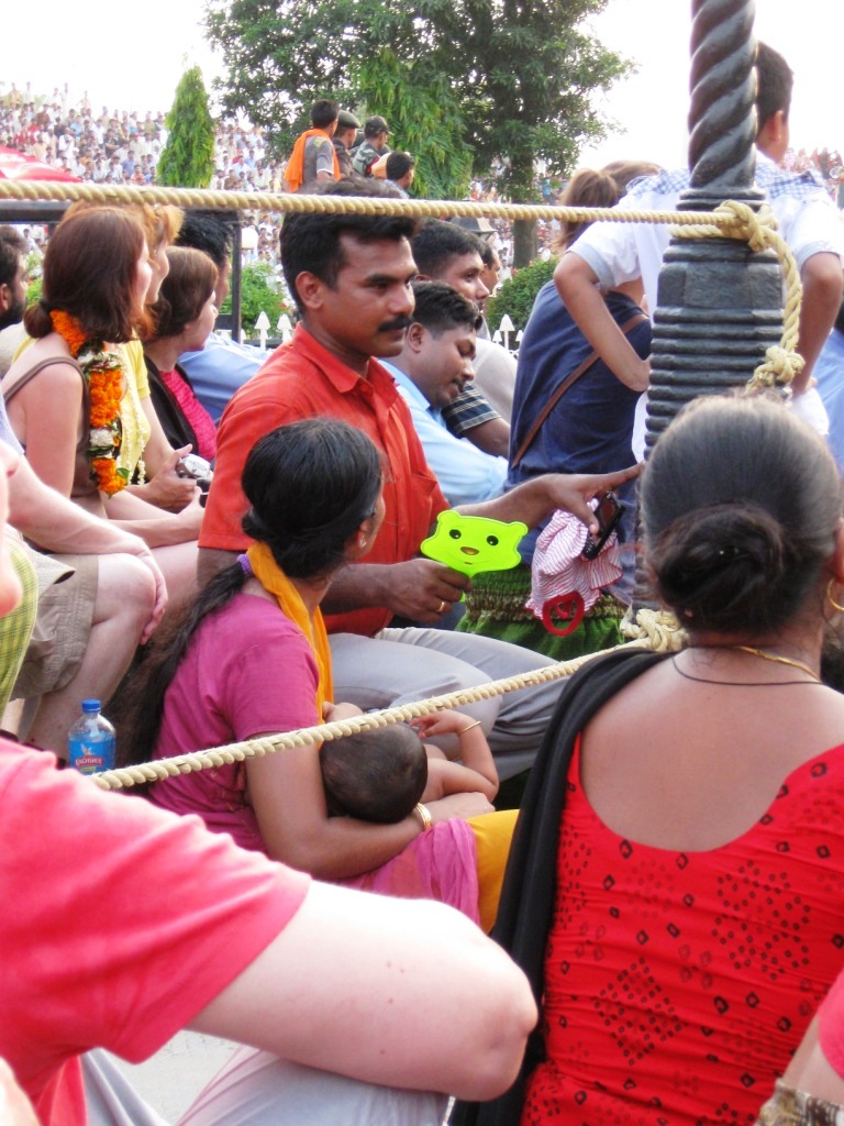 バックは持ち込めない。そのため、タクシーに荷物を置き、貴重品やカメラ、それと孔雀の羽根の団扇を持っていった。カメラ・ケースもダメだと掲示してあるが、実際のところカメラ・ケースは何も注意されない。ボディ・チェックのところで「それは何だ」と言われたのでカメラ・ケースが問題視されているのかと思いきや、そうではなく、孔雀の団扇のことを訊いているのだった。もちろん問題なし。 印パ国境ということでさぞかし緊迫しているのだろうと思いきや、それはまったくの杞憂であった。警備の軍人たちは、観光地の警備員のようなゆるい雰囲気だ。 セレモニー前から大変な盛り上がり。客席から飛び出してきて踊りだす人たちも現れ、軍人もそれを静止せず眺め、観光客は大声援で応える。セレモニーが近付くにつれて客席の混雑は危険水域に達する。自分たちは外国人観光客ということでいい場所を優先的に割り当てられていたが、そうでなければ地獄だ。夕方とはいえまだ暑い中、通勤時間の山手線か中央線かという混雑状況。近くにいた赤ん坊は泣き叫んでおり、父親が必死に団扇で風を送っていた。無事であったことを願う。ちなみに、会場には救急車もスタンバイしていた。 インド側客席。 門の向こうはパキスタン側。席が男女に分かれている。 国境のゲートを目の前にして。 ここまで入れるのはVIP(関係者)と外国人のみ。 踊りを披露する子供たち。 この赤ん坊がかわいそうでしかたなかった。 母親はセレモニーに夢中。 父親はどこを見る。 充実した施設や体制を見れば、インドの国境警備隊(Indian Border Security Force; BSF)が観光客を積極的に受け入れていることがわかる。国境見たさに人が集まってしまったので仕方なく施設を整えたのではない。積極的な意図がそこにはあるに違いない。ネイション(国、あるいは民族)が先か、国境が先か。そんなことを考えさせられた。 ホテルに戻り、夕食は近くの中級ホテルのレストランへ。ここもビュッフェ形式(Rs. 350)。ビールはカールスバーグとキング・フィッシャー。思えば、キング・フィッシャーは久しぶりだ。半年以上飲んでいなかったかもしれない。クリアな味のカールスバーグの方が好きだが、たまには雑味の強いキング・フィッシャーも悪くない。 8月3日(月) 朝9:45の飛行機に乗るため、8時前にホテルをチェックアウトし、オート・リクシャーで空港へ(Rs. 150)。1時間強のフライトでデリー着。空港からはタクシーで大学に直行し、非日常の旅路から、日常の活動へと戻った。 PR