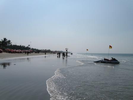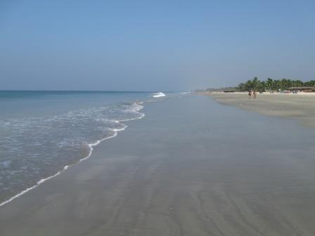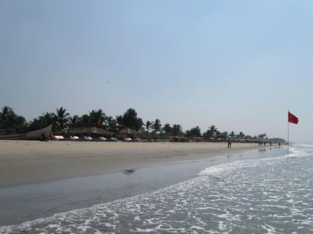 Café Coffee Dayにてアイリッシュ・コーヒー(ただしノン・アルコール)を飲み、カフェ・ラテをテイクアウトしてホテルへ戻る。 17日 朝食はホテルで。昨日と同じ。 海岸を散歩。コルヴァ・ビーチから、ずっと南へ。ベナウリム・ビーチBenaulim Beachの中心地を超えて、片道3キロくらい歩いた。波が穏やかで泳げる場所もあるということに気付く。ビーチでゆっくりすごすなら、コルヴァ・ビーチの中心地より南が良さそうだ。ビーチ・ベッドにパラソル、海の家、そして人が少なくどこまでも続くかのような長い砂浜と、くつろぐには申し分のない条件。波の穏やかなところ(とき)なら遊泳もできる(許可されているかどうかは知らない)。途中、ベナウリム・ビーチの海の家にて朝食の不足を補う。ココナッツ・ハニー・パンケーキ(予想と全く違い、クレープでココナツの実をつつんだものだった)、ラッシー、スプライト。120ルピーくらい。 【コルヴァ・ビーチから南へ】
