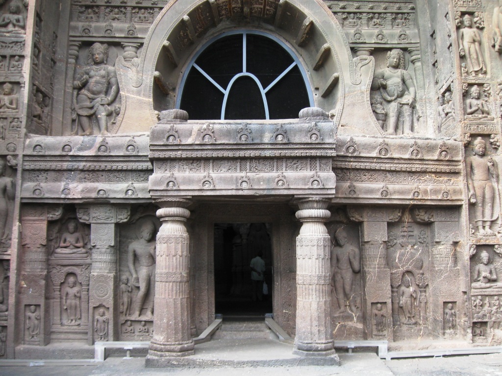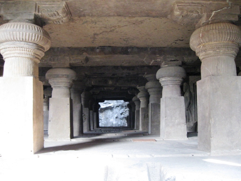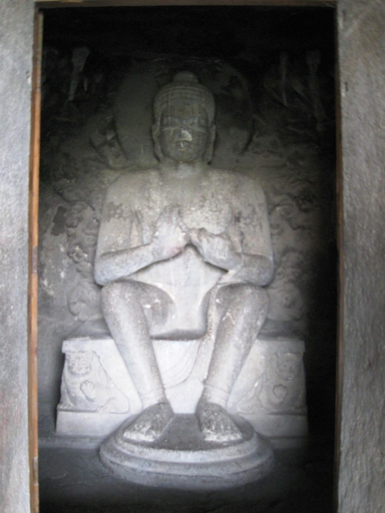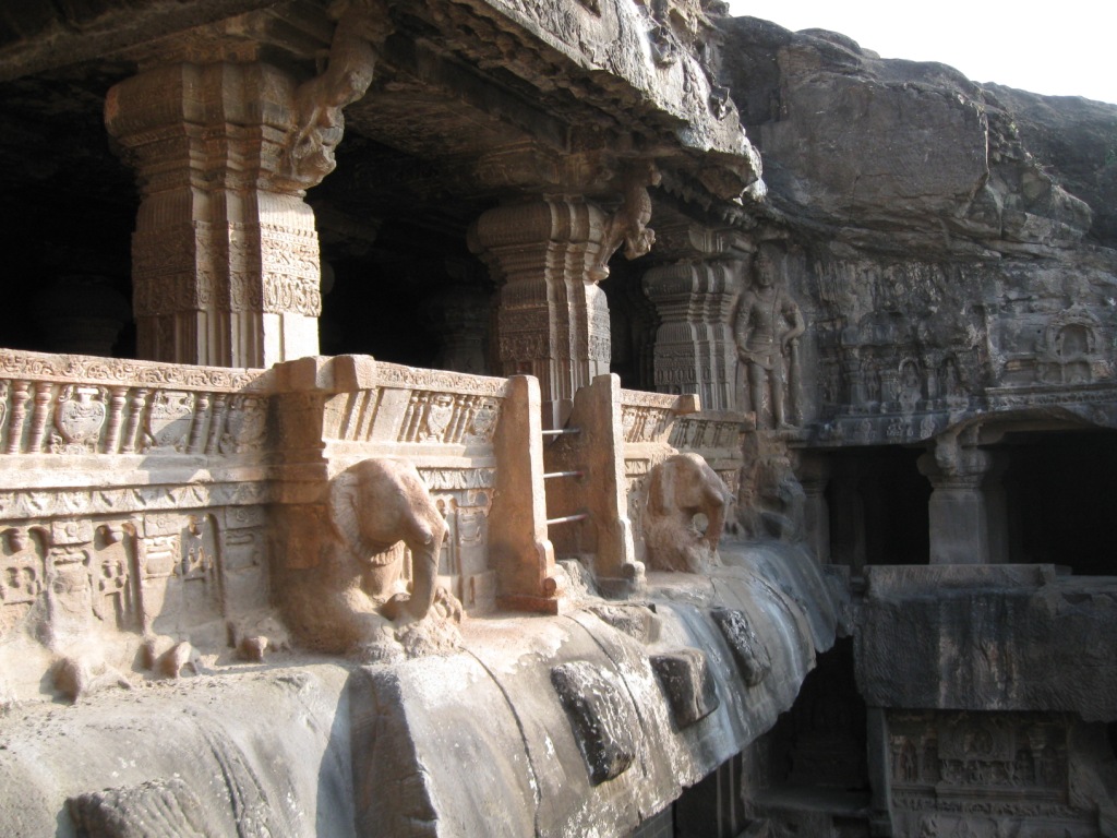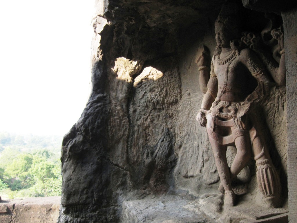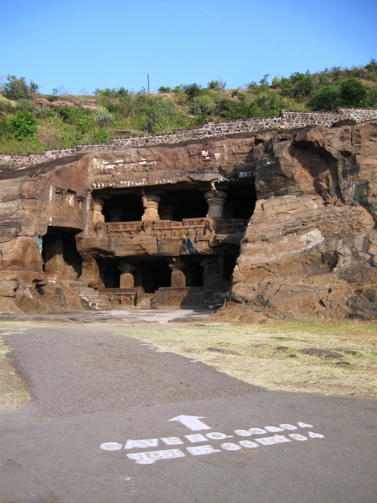 旅たちの朝を徹夜で迎えるのが習慣となりつつある。悪い習慣だ。今回は、やるべきことがあったのも確かだが、早朝のフライトのために未明に起床できる自信がなかったので、前日に昼寝をとり、夜は寝ないことにした。最近寝起きが悪いので。 午前3時に一仕事を仕上げてメールで送信し、旅の支度を始める。4時半ごろにタクシー(Radio Taxi)でやってきた今回同行のO氏と合流し、空港へ。 今回のフライトは、5:40デリー発7:45アウランガーバード着のJet Lite便。フライトの1時間ちょっと前には空港に到着した。チェックインカウンターはやや混雑していたが、セキュリティ・チェックはガラガラで、余裕をもって搭乗準備完了。Costa Caféで軽めの朝食にマフィンとカプチーノ。 出発はほぼ定刻。機内の飲食は有料。サンドウィッチを食べたが、非常にまずかった。 到着もほぼ定刻。アウランガーバード空港。到着したその機体以外に航空機が見当たらないような小規模空港。ターミナルはそこそこきれい。機能と比較して無駄に大きなターミナルは、アムリトサルを連想させる。 気温30度弱。それほど暑く感じない。下はデニム、上は長袖のシャツを着ていたが、それでちょうどいいくらい。 ターミナルで声をかけてきた旅行会社のおじさんに従い、8時間Rs. 950で車をチャーター。市内とエローラ観光込み。名刺を受け取ってから気づいたのだが、『歩き方』や『ロンプラ』オススメのClassic Travelという会社だった。ちなみに、市内行きだけならRs. 200とのこと。 空港から1時間弱。エローラ石窟群に到着。都市間を結ぶ主要路線の路面はそれなりにちゃんと整備されていた。辺りは思いのほか緑が多い。農業はあまり盛んな感じはないが、平地には草や木が生い茂り、ヤギや牛の放牧や、場所によっては綿花の栽培。台地には草が茂り、ポツポツと木もある。ゆったりとそびえる岩盤台地には、平行に地層が走る。街道沿いの樹木は、デリー近郊の比較的新しいそれとは違い、かなり年季が入っている。 エローラは6世紀から9世紀ごろにかけて、岩盤をくりぬいて作られた石窟。全34。便宜上番号が振られており、1から12が仏教、13から29がヒンドゥー教、30から34がジャイナ教というそれぞれに異なった宗教の遺跡となっているらしい。見た実感として、そうした違いの重要性は正直なところよくわからない。 入場料はRs. 250(外国人プライス)。初めにジャイナ教石窟群(34→30)を見て、それから車で移動し、残り(ヒンドゥーと仏教、29→1)は一気にまとめて見た。車で石窟のすぐ近くまで行けるとはいえ、かなりの距離を歩くことになる。暑い時期には厳しいだろう。 第34窟からスタート。