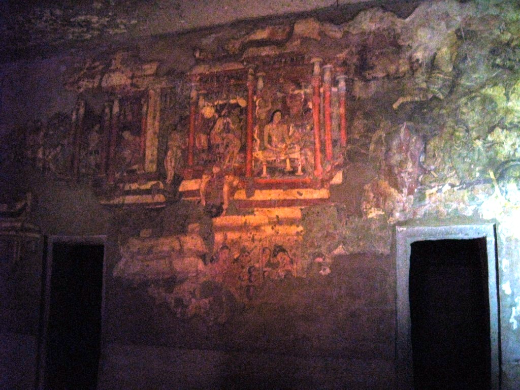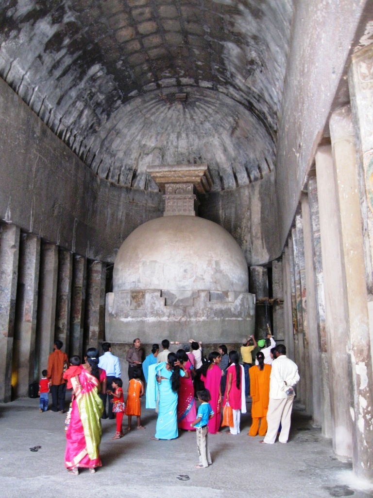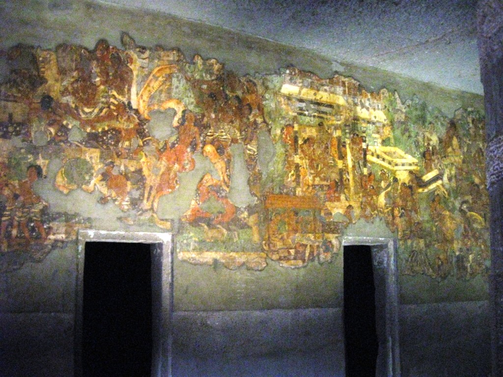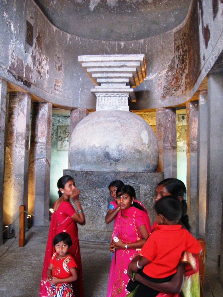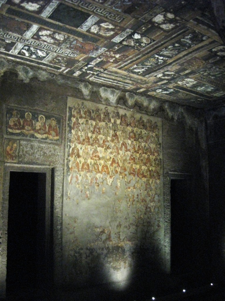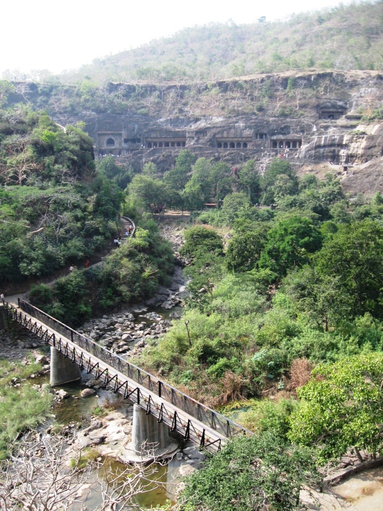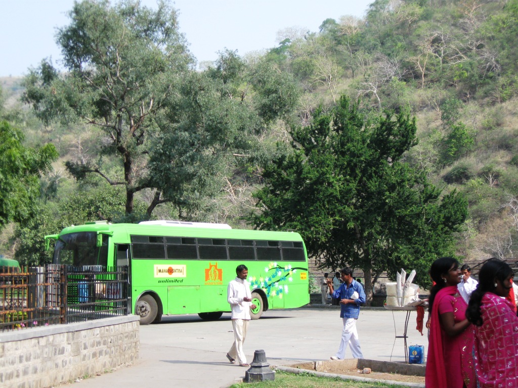 2日目はアジャンターを攻める。前日と同じClassic Travelで車をチャーター(Rs. 1,800)。8:30にスタート。 アジャンターの石窟群までおよそ片道2時間。プラス朝食休憩30分。11時頃に到着。エローラとは違い、車で石窟近くまでは入れない。駐車場からバスに乗り換える。あたりは土産物屋が立ち並んでおり、売り子がつきまとってくる。しかしさほど押し付けがましくなく、不快度は低い。しかもなぜか、「あとで」とばかり言ってくる(日本語で)。すぐに店に引きこもうとはしないのだ。 バス(Rs 12)で石窟入り口近くへ。そこでチケットを買い(Rs. 250、外国人価格)、歩いて巡る。計30の石窟がある。 ちなみにインドの世界遺産はタージ・マハル(Rs. 750)を除いてどこも統一価格。 アジャンターの石窟は、紀元前1世紀から紀元2世紀(=前期)、ならびに5世紀後半から6世紀(=後期)にかけて作られた仏教寺院。