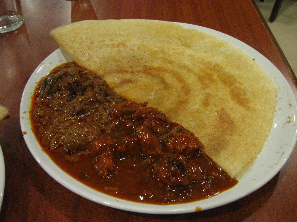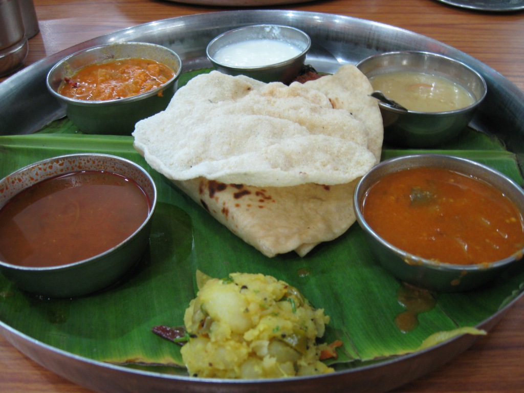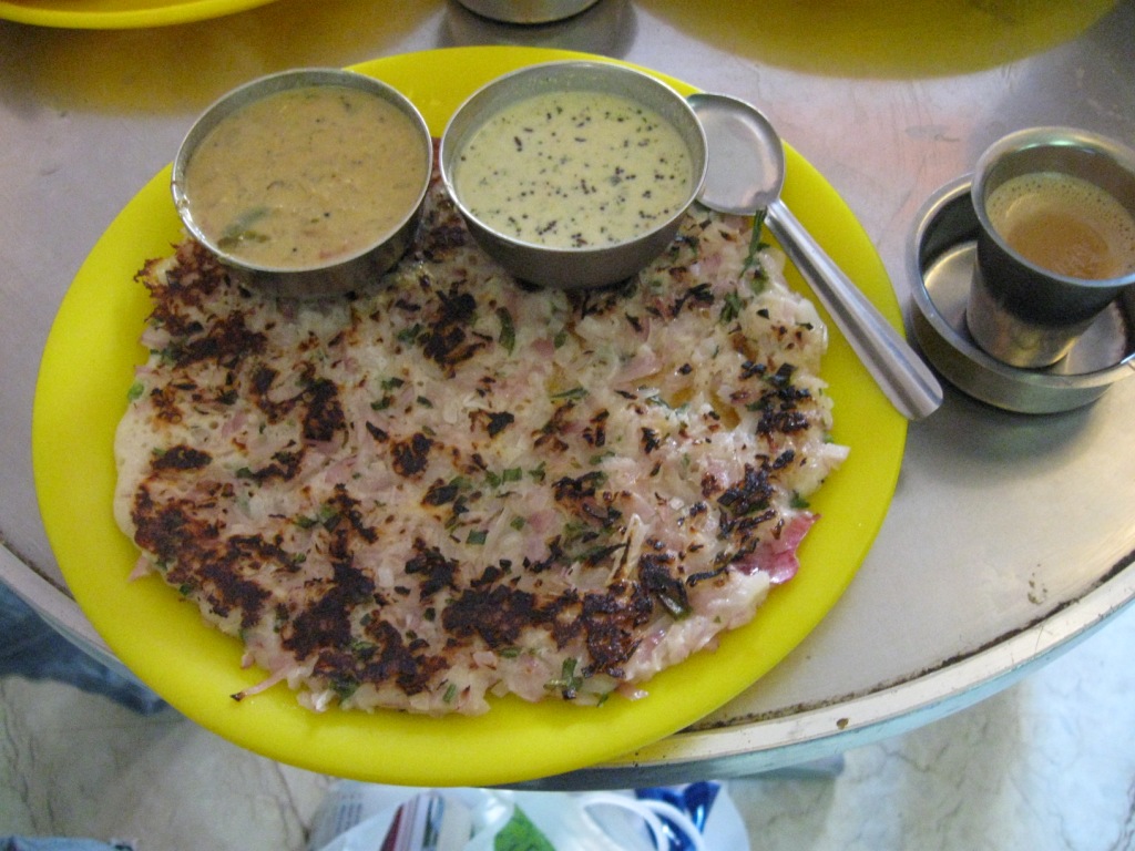 バス・ターミナル近くの食堂で朝食。立食形式。周りを見渡すと、ヴァーダvadaをスープ につけて食べるのがポピュラーな朝食スタイルのようだ。O氏はマサーラー・ドーサー(Rs. 20)を、自分はオニオン・ドーサー(Rs. 23)を注文。マサーラー・ドーサーはよくある普通のドーサーに見えた。だが、自分の注文したオニオン・ドーサーは、どう見てもウタパームにしか見えない。「これがオニオン・ドーサー?」「そうだ」「ウタパームでは?」「オニオン・ドーサーだ」店員はオニオン・ドーサーだと言い張る。今でも納得はしていない。味は普通。朝食としては、少し油がきつい。やはりヴァーダがちょうどいいのだろうか。 オニオン・ウタパーム