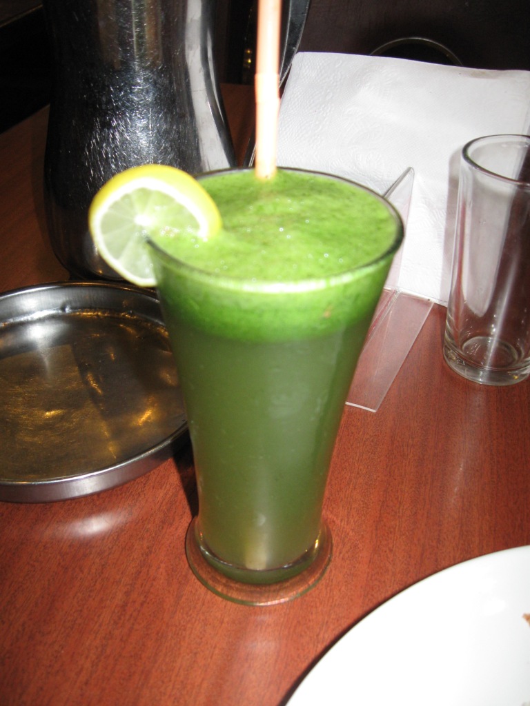 チェック・インを済ませ、併設のレストランで軽めの夕食。チキン・ドーサー(chicken dosa, Rs. 90)、レモン・ミント・ライム・ソーダを注文。チキン・ドーサーは、いかにも南部の味。ココナッツの風味豊か。ただ、やや辛すぎ。ソーダのほうはまったく予想外の品が出てきた。ミントやライムで軽く風味をプラスされたソーダを期待していたが、出てきたのは青汁らしき飲み物。大量のミントを砕いた、いわばミント青汁。ミントの風味自体はもちろん悪くないが、いかんせん葉っぱを砕いた青汁であり、おいしいとは言い難い。スパイスをふんだんに使うことがインドの人々にとっての贅沢であるという私の仮説が正しければ、彼らにとってこれは最高に贅沢な飲み物なのかもしれない。 ミント青汁