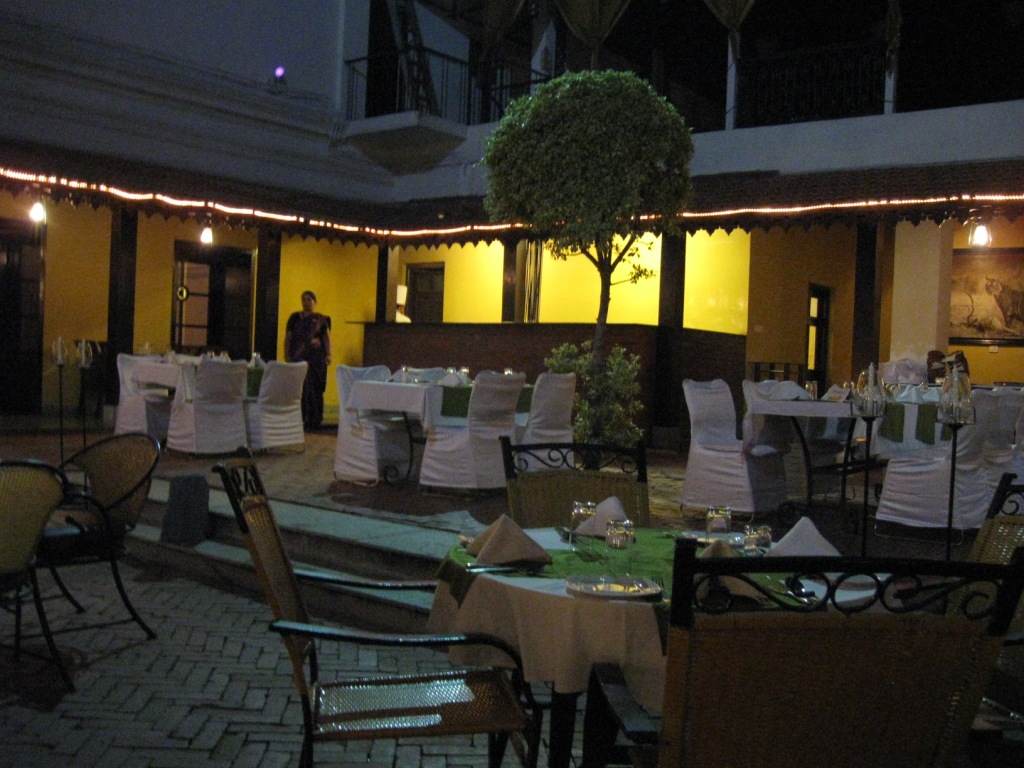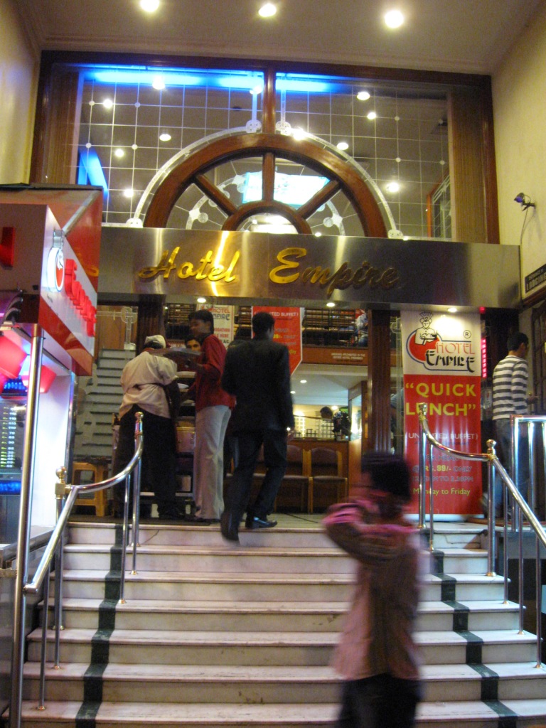 市街は空港から離れていた。きれいに整備された道を、タクシーが猛スピードで進む。道路の流れが全般的に速かったが、とりわけ速いタクシーだった。速度は100km/hほどまで出ていた。空港から市街中心地のホテルまで約40km、料金はRs. 600弱。 市街中心地のMGロードにある、ホテル・エンパイアHotel Empire。レセプションと思しきところを訪ねると、そこは併設のレストランのカウンターであった。ちなみに、南インドではホテルhotelという語がレストランのことも意味する。レストランではなく部屋のほうの意味でのホテルのレセプションに行き、予約を確認するが、予約はないと言う。調べてもらうと、このホテルはいくつか支店があり、予約してあったのは市内の他の支店であった。さっそくオート・リクシャーで移動。距離がわからなかったため向こうの言い値でRs. 50払う。結果的には払いすぎだった。すぐに予約してあるほうのホテル・エンパイアに到着。ここも先の支店と同じく、地上階がレストランになっていた。 ホテル・エンパイア。深夜なのに人でにぎわう