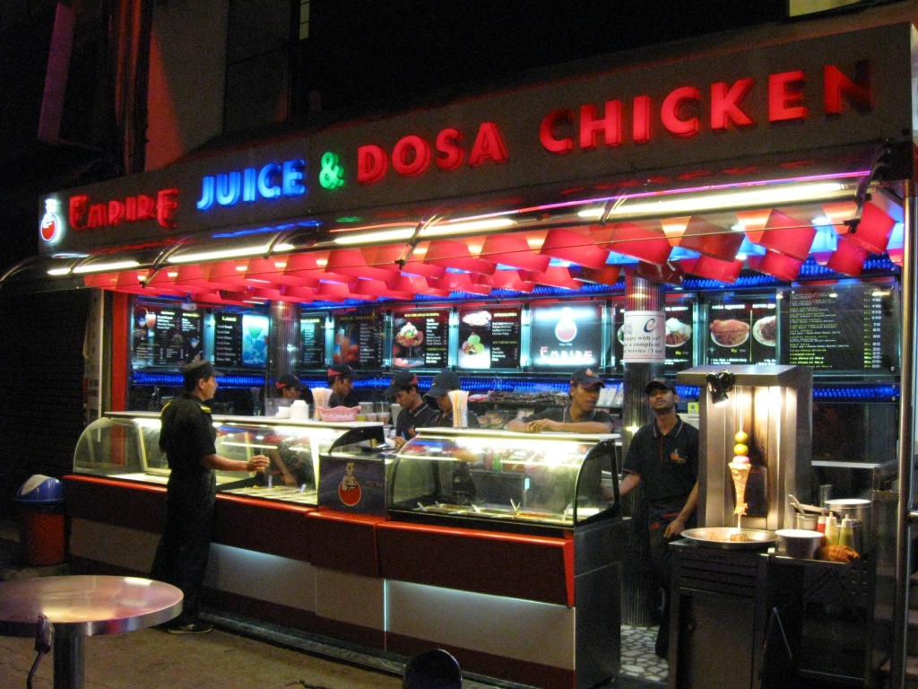 このとき、すでに夜12時を過ぎていたが、レストランには多くの客がおり、ダーバー形式になっている外の売店(基本的にレストランと同じメニューを提供)にも多くの客がいた(バナナ・ミルク・シェイクを注文した)。バンガロールの人たちは夜更かしする傾向があるのだろうか。この街出身のクラスメイトがいるので、聞いてみたいものだ。 ホテル外に設けられた立食式のレストラン(?)