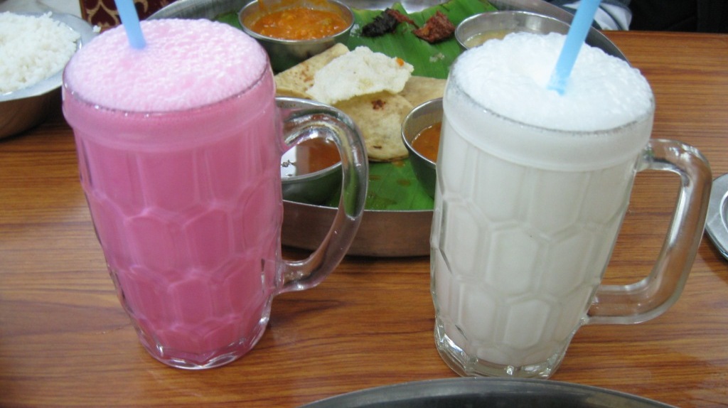 いざ、バス・ターミナルへ。とにかくでかい。全貌が把握できないほど大きい。問題は、行き先を示す文字が読めないことだ。字が丸い。カルナータカ州のカンナダ語Kannadaだと思うが、もちろん判別不可能。アルファベット表記が少ない。これは厳しいと思いながらマイソール行きのバスを探しはじめると、幸いタイミングよくマイソール行きのバスの呼び込みに遭遇。乗車するとすでに多くの座席が埋まっていた。Rs. 70くらいだったはず。最後部座席に座ると、まもなく発車。かなりボロいバス。窓を開けると空気の汚れが顔を直撃し、窓を閉めると暑くて厳しいという状況。だが、前の座席の人が窓を全開にしていたので、否応なく風を顔に受け続けた。3時間ほどでマイソール着。早くシャワーを浴びて顔と髪を洗いたいが、今夜は夜行バス移動のため、しばらくそのチャンスがない。まずは到着したバス・ターミナルで夜行バスのチケットを確保。バス予約のシステムは思いのほか近代的。コンピューターの画面を見て、空いている座席を確認して選べる。マイソールからコーチンまででRs. 429。夜8:30発予定。それまでの時間をマイソールの市内観光に充てる。 その前に、やや早かったが、まずはランチ。バス・ターミナルの近くの食堂へ。エアコンの効いている、多少上品そうなベジ・レストラン。南インドらしいものを食べようということで、ミールスを注文(Rs. 50)。ターリーの南インド版と解釈をしている。バナナの葉が引かれているのが特徴。とりたてて印象には残っていないが、無難においしかった。O氏の注文したローズ・ミルク・シェークは着色料のものと思われる不健康そうな味で、ひどかった。こちらのバニラ・ミルク・シェークは問題なし。 ミルク・シェーク。左がローズ、右がバニラ