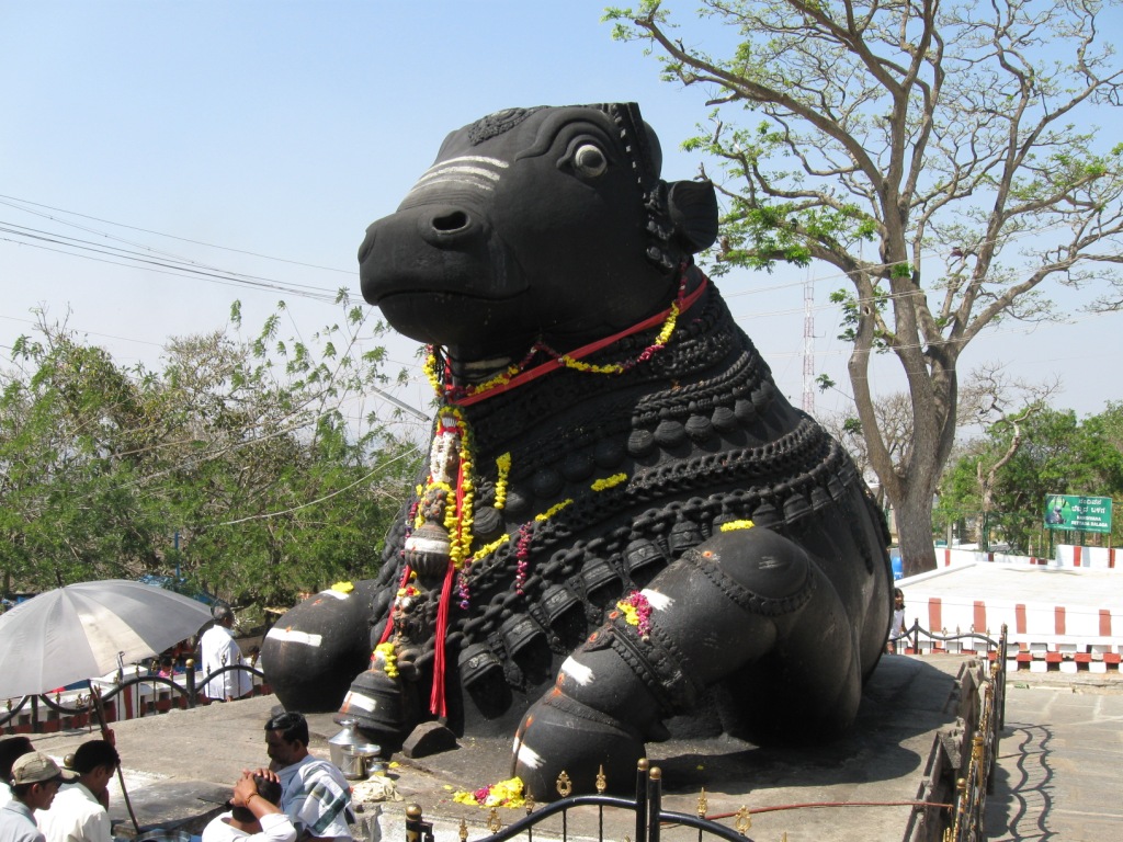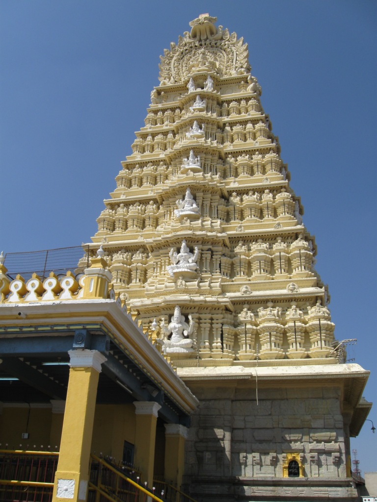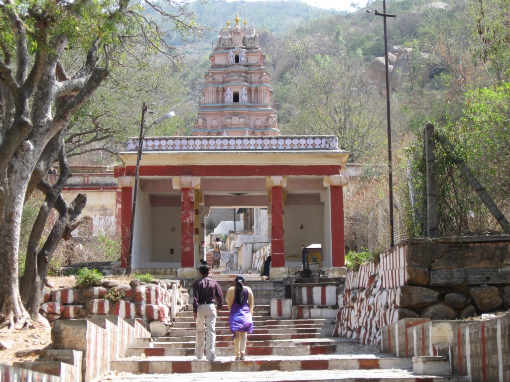 マイソールは近郊まで足を延ばせばいろいろと見どころがありそうだったが、時間の制約上、『地球の歩き方』にあった市内の観光スポット3つを選び、巡ることにした。 まずはチャームンディーの丘Chamundi Hillを目指す。オート・リクシャーをひろう。価格交渉をしようとすると、メーター通りだと言う。デリーではあまりないことだ。ましてやこちらはいかにもバック・パックを背負った外国人観光客だと言うのに。行き先を告げると、麓か山頂かと聞かれる。そんなに大きな丘なのだろうか。時間の制約もあるので、山頂までと言うと、ならRs. 200だとの返事。判断の難しいところであったが、オート・リクシャーでRs. 200と言われると、高いと感じてしまう。結局、麓までにしてもらった。ちゃんとメーター通りでRs. 46。参道の入り口のようになっており、そこから階段道が山頂に向けて続く。山頂まで続く道路もあり、オートで行くことも可能。 参道入り口