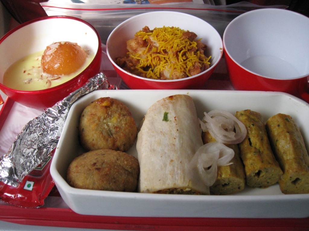 航空会社は、行きはジェット・エアウェイズJet Airwaysを利用した。前回のゴア行きのときはデリーの国内線空港でキングフィッシャーKingfisherのカウンターが大混雑だったことが思い出された。今回、ジェットのチェック・イン・カウンターは空いており、すぐに完了。ちなみに、キングフィッシャーの方は今回も長蛇の列となっていた。セキュリティ・チェックはそれなりに混雑していたが、順調に流れており、さほど待たされなかった。キングフィッシャー以外なら出発の1時間前に空港に到着するくらいでも問題なさそうだ。セキュリティ・チェックでは、筆箱に入れてあった小型のドライバーが引っ掛かってしまった。これが認められていないことはもちろん知っており、筆箱から出してくるつもりだったのだが、つい忘れていた。係員の協議の結果、問題なしということで、意外とすんなり返してもらえた。ちなみに、ゴア行きのときも同じトラブルがあった。過去の失敗を生かせていない。 バンガロール行きの直行便。機内設備は、ゴア行きに利用したキングフィッシャーに比べるとやや貧弱。ジェットのフライト・アテンダントの地味な制服はキングフィッシャーとは対照的。金曜夜ということもあってか、ほぼ満席。このフライトでは、2点不満があった。まず、一番後ろの座席でリクライニングができないこと。もう一つは、最後尾座席とも関係して、機内食のノン・ベジが品切れで、ベジ料理しか選べなかったことであった。チケット購入時にわざわざノン・ベジ料理を指定しておいたにもかかわらず、である。自分のほうにはノン・ベジの一品があとで追加されたが、同行のO氏はそれすらなしの完全ベジ。お詫びの品なども一切なし。 ジェットの機内食。右上が追加されたノン・ベジ。味は機内食としては良いほう。