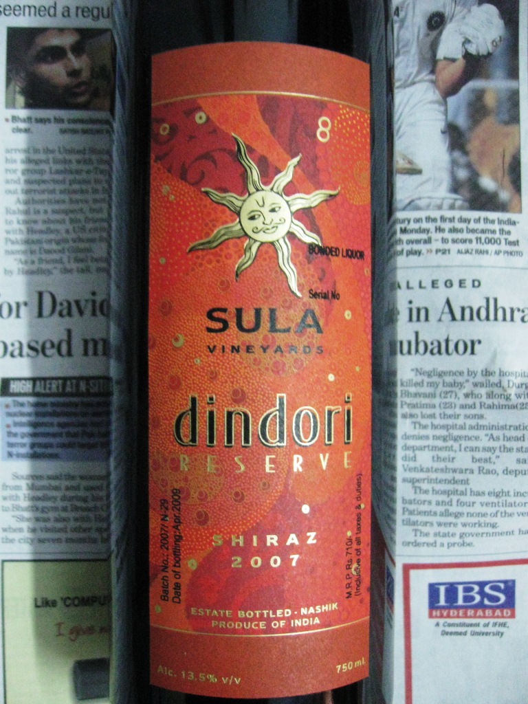 パニールが乳製品でありチーズの一種であるのは確かだが、味や使用法からしていわゆるチーズとはかなり違う。ある日本からの来客には、「乳製品でチーズの一種だけど、味や食感は豆腐」と説明したら納得してもらえた。 そういえばあるとき、中国人学生が、豆腐とは何かをインド人学生に尋ねられて「パニールです」即答していた。機能的観点からすれば間違ってはないが、でも何か違う。 ともかく、パニールではなく、いわゆる普通のチーズの話。インドでチーズは一般的でない。高級スーパーに行くと、高価格な輸入物が並んでいる。そんななか、比べると破格に安いインド産チーズ(パニールではなく)もある。これ。 インドでは乳製品メーカーとして有名なAmulのゴーダ・チーズ。写真は、チーズ2つ(各250g)とミニまな板とナイフがセット(Rs. 275)。こういう目を引くセットで顧客を開拓しようとしているのだろう。今回は付録につられて買ったが、前から何度も購入している。味は特徴の弱い地味なゴーダ・チーズ。しかし何といっても安い。 というわけで、今日はインド産チーズをつまみにインド産ワインをいただく。 Sula Vineyards Dindori Reserve Shiraz 2007 (Rs. 710) 苦味が非常に強い。でもさほど重くない。変わった味だ。