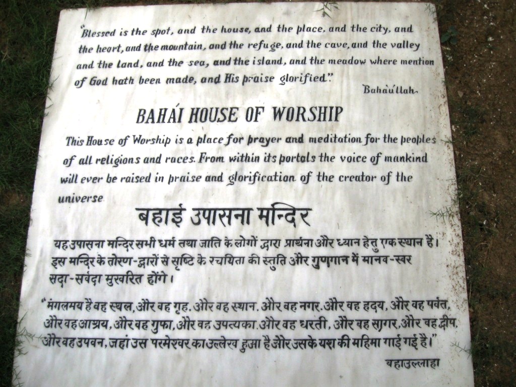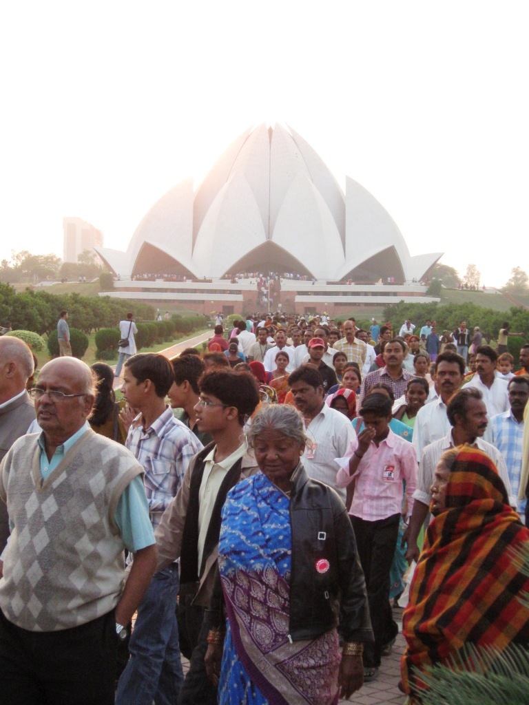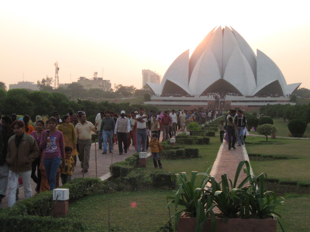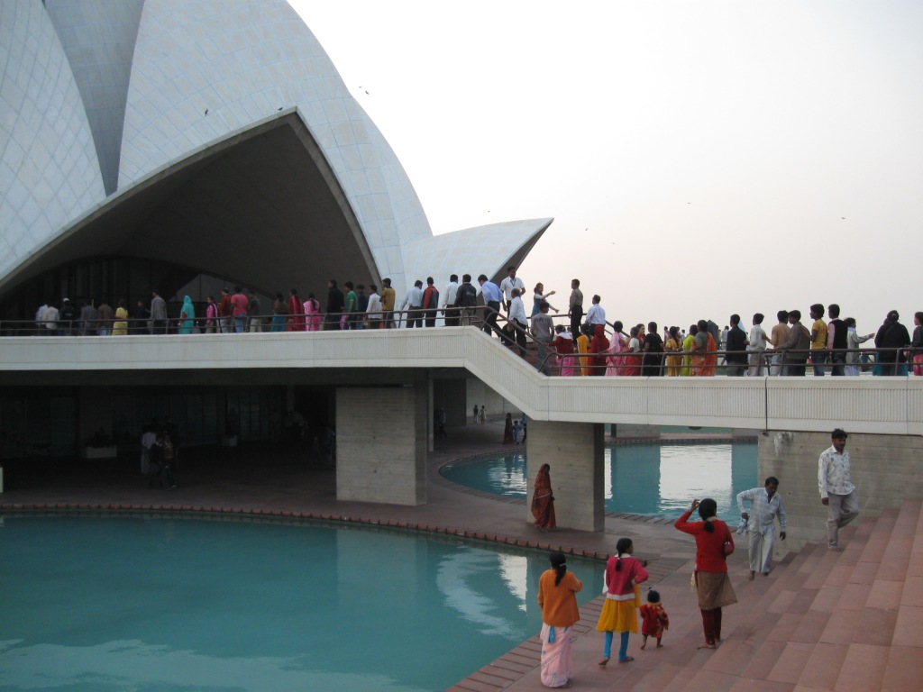 ネルー・プレイス(Nehru Place)近くのロータス・テンプル(Lotus Temple)。奇妙な近代的建造物を遠くから見たことはあったが、接近するのはこれが初めて。デリーの観光スポットの1つにもなっている有名な場所だ。 公園の入口には、続々と観光バスが止まり、どんどん人が運び込まれてくる。(自分はJNUからオートで。Rs. 80) 正式にはBahai House of Worship。Bahaiというのはイランの宗教、だそうだ(参照)。知らなかった。 しかしここを訪れている人を見ると、宗教的には多様。ややシク教徒が多いような気がする。外国人観光客は非常に稀。 中に入る前、靴を脱ぎ、それから2列に並ばされる。何かと思えば、説明をしてくれるだけだった(英語とヒンディー語で)。「中はお祈りの場所なので、静かにしてね。好きなだけ居ていいですよ」みたいなこと。 中は講堂になっている。ほとんど宗教性は感じられない。唯一狭い天井部に、何やらアラビア文字の文様があったが。 要するに、宗教を問わない祈りの場ということらしい。しかし、実際にはほとんどの人が見物をして退場している。なので、結局何のための施設なのか、よくわからない。見たところ、巨大建築物を物珍しそうに観察する人たちしかおらず、現代の宗教施設としては意味を成していないと思うのだが。 何らかの戦略的意図があるには違いないのだろうけど。。。