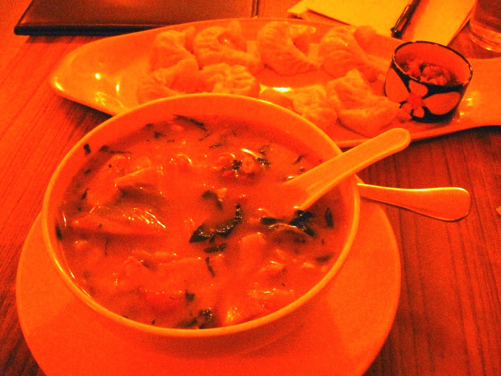 ラージパト・ナガル(Lajpat Nagar)は南デリー東部の住宅街。これまでまったく縁がなく、これが初めての到来。 夕方にロータス・テンプルを散歩して、そのあとオートでラージパト・ナガルに移動し、しばらく散歩して時間をつぶしてから目的地のチベット・キッチン(Tibet Kitchen)を訪れた。時間をつぶしたものの、それでも夕飯時にはだいぶ早くまだ開いていないと思ったが、予想に反して開いていた。たぶん午後6時ごろ。 すでに客が1組いた。先客、自分、店員を含めて、いわゆるインド系の顔立ちが1人もいない不思議空間。しかも、写真はとらなかったが、内装が変。なぜか「ラーメン」や「ラムネ」の提灯に、「特製 氷」(かき氷屋のあれ)の垂れ幕。壁には「書」の漢字が様々な字体で書かれている。日本か中国かと思わせておいて、メニューは本格的なチベット。ただし、中華もある。もちろん、ラーメンもラムネもかき氷もない。 ベジ・モモ(Rs. 50)とトゥクパ(Tibet Special Thukpa、Rs. 75)を注文。 トゥクパ、ナイス。チキンとマトン入り。スープはとろとろで、マトンのクセがいい方向に反映されて、いい味を醸し出している。パクチーの存在感も強い。そして麺ではなく、代わりに、ワンタンの破片のようなやわらかいもの(パスタと呼ぶべきか何と言うべきか)が入っている・・・?いや、これって、トゥクパじゃなくてメニューですぐ下にあったThenthukじゃないのか・・・?指でさして注文したから、間違えたのかもしれない。まあ、どちらでもいいや。 モモは普通。 (写真の色がおかしいのは、店内の照明の色がおかしいから。) モモは大したことなかったが、トゥクパ(?)の美味しさだけでも十分足を運んだ甲斐があった。価格も非常に安い。近くにあれば頻繁に通いたいくらいだ。 大きな地図で見る