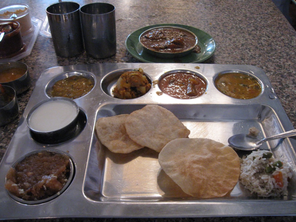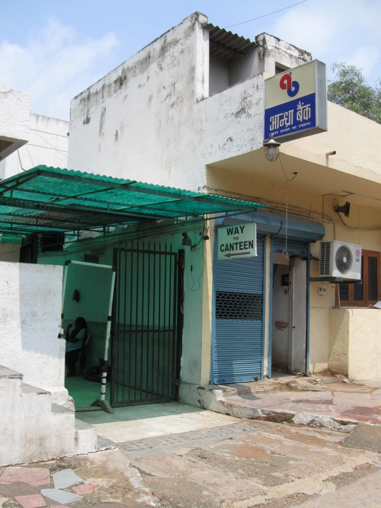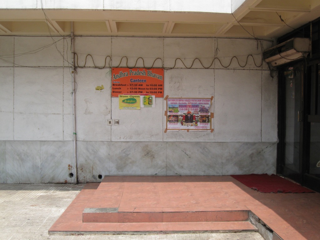 クオリティの高い南インド料理と手頃価格で有名。部外者でも立ち入ることができる。よく話には聞いていたのだが、今回初めて来た。 JNUからオート・リクシャーでやってきた。「アーンドラ・プラデーシュ・バヴァン」で意味は通じたが、どこにあるのか正確には知らなかったらしく、何度か道を聞きながらたどりついた。 この日はくしくも、この州の首相がヘリコプターの事故で行方不明となっており、遺体発見のニュースが新聞の一面を占めていた。そのため、庁舎の外や、食堂の中に州首相の写真が飾られ、献花台のようになっていた。 食堂に来る客が多いのだろう、庁舎を通らず外から入る道案内が出ており、迷わずに済む。 ランチ開始の12時ちょうどごろに到着。 先にカウンターで食券購入。ターリーRs. 80がメイン。サイドメニューとして、ノンベジ(チキン、マトン、フィッシュ)のフライとカレーがある。こちらも各Rs. 80。ターリーとフィッシュ・カレーをオーダー。 ターリーは美味。いかにも南の味。酸っぱい、辛い。 なぜ酸っぱいのか、わからない。なぜ辛いのか、わからない。何を使っているのか。北インドの料理と違い、自分の経験値が低いため、わからないことだらけ。 ターリーのカレーやライスは、どんどん追加してくれる。スタッフが大勢いて、こちらの皿を見張っていて、減ってきたものをすかさず追加するかどうか聞いてくる。勝手に追加してくる店もあるが、ここは聞いてくれるので助かる。 フィッシュ・カレーはいまいち気に入らない味。これも酸っぱい。 北インド風にアレンジされてしまった名ばかりの南インド料理とは違う、本格派の南インド料理という印象だった。