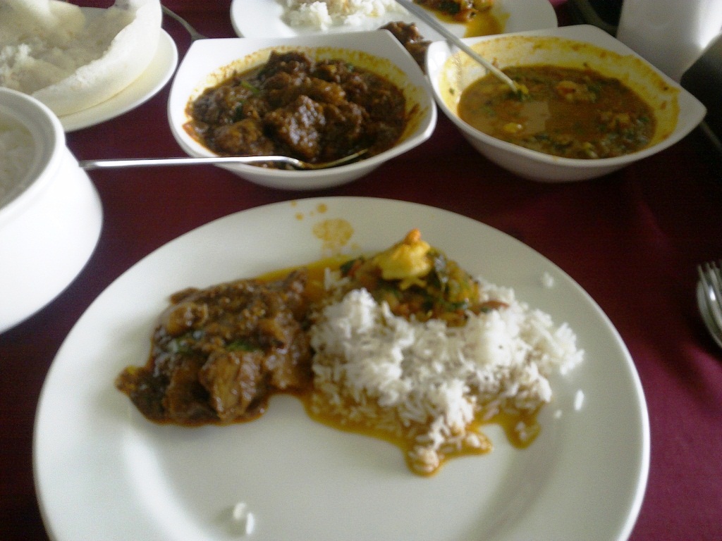 ランチを求めて12時過ぎに到着。1番乗り。 前回も頼んだえびカレーに加えて、今回はポークカレー(Idukki Pork Curry)も(写真上中央)。 ポークカレーには、奇跡的に普通にうまい、という矛盾した表現をあてておく。日本の洋風レストランで食べられそうな、ハイレベルなポークカレーだ。そもそもインドで豚料理は多くないし(人口のほとんどが口にしない)、美味しい豚肉料理なんて高めの日本料理レストラン以外ではまず出会えないものだ。ゆえに奇跡的。 主食はご飯とアッパム(写真左上見切れ)。アッパムとは、米粉のふんわりクレープみたいなもの。旨し。酸味がナイス。 今回も大満足。 そして客は今回も欧米系ばかり。デリーではなく、南インドのリゾートのような光景がそこにはあった。