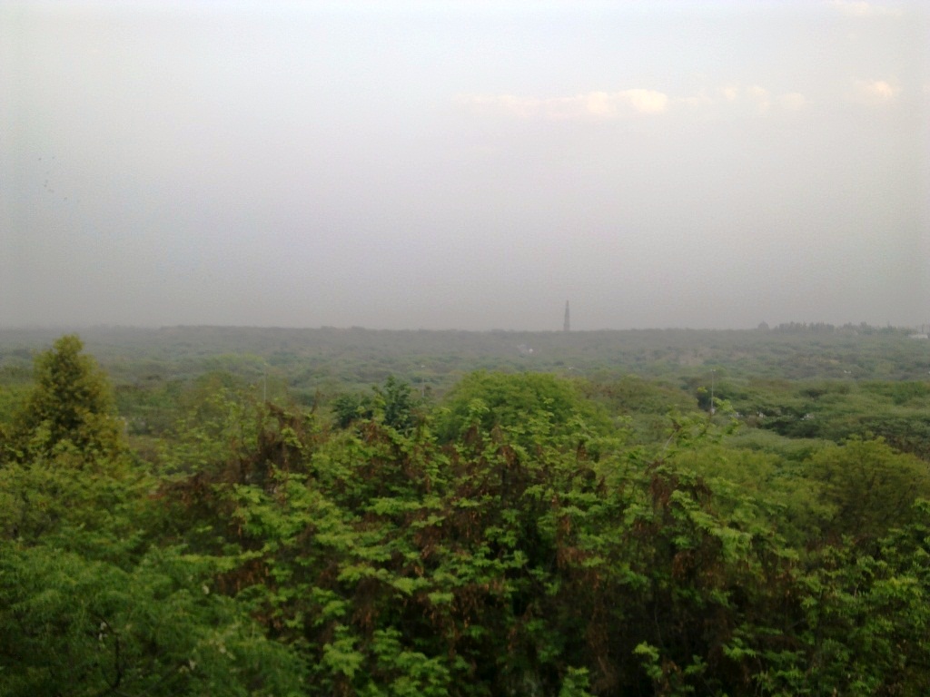 ![]() 自分用インド土産の1つとして購入したこの本。インド伝統料理のレシピ集。 とはいっても、自分でインド料理をつくるつもりはなく、いわば思い出の品として。 この本の著者は、自分がインドで出会った人物の中で、最も印象的な人物の1人。 JNU、ブラフマプトラ寮屋上からの風景。 停電時に屋上に避難したときに携帯電話で撮ったもの。 遠くにうっすら見える塔は、世界遺産のクトゥブ・ミナール。 この写真だけ見ると、まるでジャングルの中に住んでいるかのようだ。