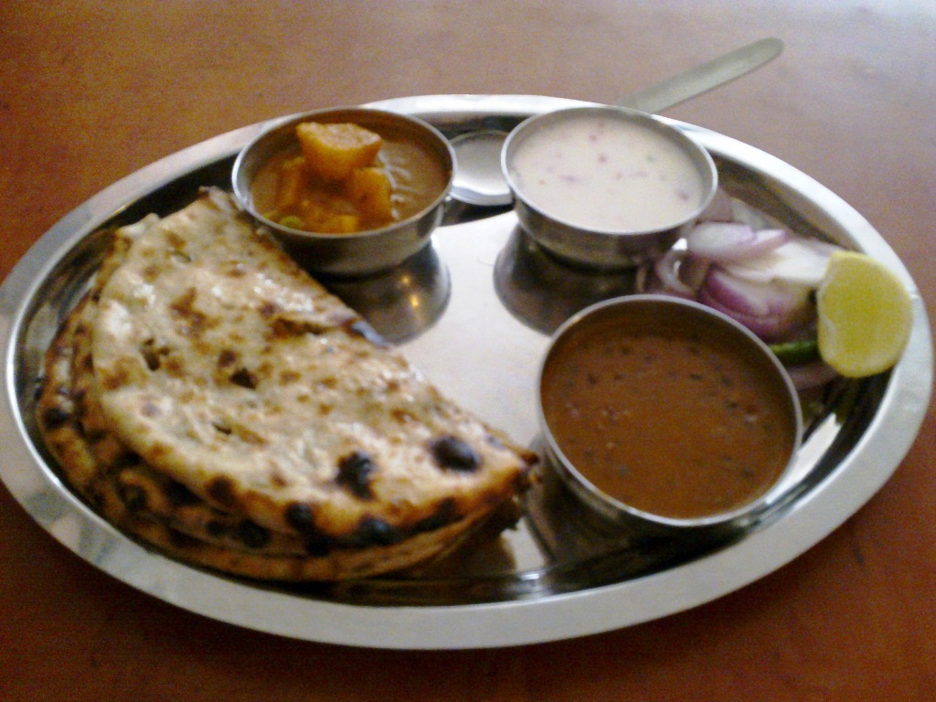 昨日は、乗っていたオートリクシャーが給油のため、スタンドに入った。一言客に断ってから入れ。それに、目的地まですぐなのだから、給油は後でもいいだろ。 今日は、乗っていたオートリクシャーが途中で壊れた。確かに、最初に声をかけたとき、車体の裏を覗いていたから、その時点からおかしかったのだろう。 しょうがないので、壊れた地点から他のオートに乗り換え。運賃の話は運転手間でつけてくれた。さすがにこっちに損はさせない。当初の約束の金額をだいたいの距離に応じて2人の運転手に分けて支払うことにした。 しかし、乗り継いだオートの運転手がまたひどい。まずは道を間違える。とんでもないガタガタの道に入っていったので、てっきりハイレベルな抜け道なのかと思ったら、タダの行き止まり。そして遠回り。しかも給油。最悪だ。 金額は乗り継ぎ時に話をつけた通りの金額で。間違えて遠回りになったので、メーターの指し示す金額よりも、支払い金額のほうが安い。何か言ってくると予測して身構えていたが、何も言ってこなかった。さすがに申し訳ない気持ちはあったのだろう。 ランチのキーマ・パラーンター・セット(Rs. 95)。 羊のひき肉を練りこんだパラーンター(左)。 臭い。羊肉臭い。そのまま。 スパイスで巧みに臭みを消すのがインド料理の腕の見せ所のはずだが、 これはヒドい。 値段は安いが、味も相応ということで。 店員の応対がいい店なのに、もったいない。