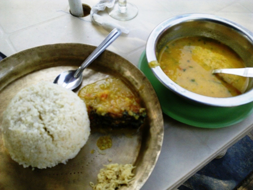 汁に細かいジャガイモが浮かんでいる。その時点で期待度激減↓。 ライスも固そうだし。 魚のフライに、スプーンを突き立てた瞬間、驚いた。 柔らかい。 インドでおなじみの、干物を長時間唐揚げしたかのような、固いフィッシュ・フライとは違う。日本で出会うような、柔らかいフィッシュ・フライだ。 期待度↑。 ご飯の山を崩し、魚とカレーをまぜあわせ、口に運ぶ。 うまい。実にうまい。 カレー自体の味は大したことない。ただし、珍しい。まったく辛くない。ターメリックとサフランがメインだろうか。パクチーも軽く個性をアピールしている。ジャガイモが意外と邪魔をせず、むしろまろやかさをもたらす。とはいっても単品で食べて美味しいものではないと思う。安い店のダールみたい、と言えばインド関係者はイメージがしやすいだろうか。 すっきりカレーと、柔らかい魚唐揚げと、ご飯が合わさったときに、組み合わせの妙が生まれる。 スプーンが進む。心が弾む↑。 しかし、途中で異変。 脳がストップを命じている。スプーンを置け、と。 なぜだ! 大した量を食べていないのに! 辛くもないし、何が問題なんだ! 自分の体が送るメッセージを理解できずに苦しむ。 ふと気づく。 重い荷物を運び(部屋→タクシー、タクシー→郵便局)、長時間直射日光にさらされ、朝から食事もとらずにここまで動き続けた今日の履歴を。 疲れた胃腸が、助けを求めているのだ。 東京への長距離移動を翌日に控えた状況も勘案し、泣く泣くスプーンを置いた。